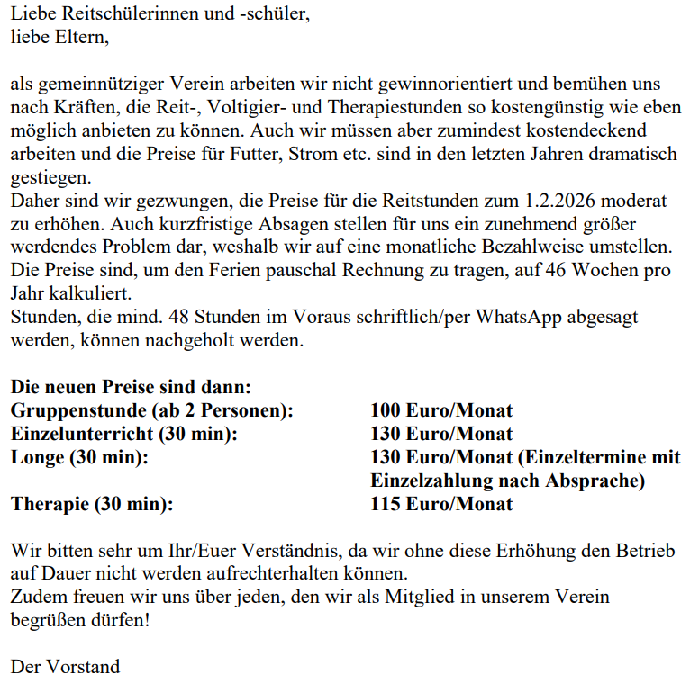 Unser Verein wird ehrenamtlich und auf Selbstkosten-Basis geführt. Wir versuchen unsere Aufwendungen so gering wie möglich zu halten, um Reitsport für jeden zu ermöglichen.